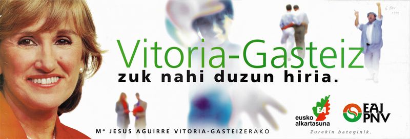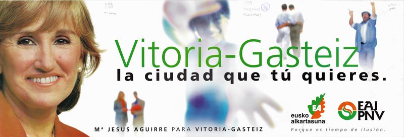 Título: Vitoria-Gasteiz, la ciudad que tú quieres [Material gráfico] : Ma. Jesús Aguirre para Vitoria-Gasteiz : porque es tiempo de ilusión = Vitoria-Gasteiz, zuk nahi duzun hiria : Ma. Jesús Aguirre Vitoria-Gasteizerako : Eusko Alkartasuna, EAJ-PNV