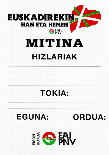 Título: Euskadirekin han eta hemen [Material gráfico] : EAJ-PNV : mitina, hizlariak, tokia, eguna, ordua : emon botoa EAJ-PNV
