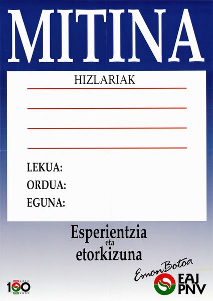 Título: Mitina [Material gráfico] : esperientzia eta etorkizuna : eman botoa EAJ-PNV : EAJ 100 urte, PNV 100 años