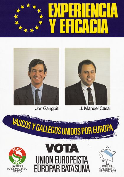 Título: Experiencia y eficacia [Material gráfico] : vascos y gallegos unidos por Europa : vota Unión Europeista-Europar Batasuna : EAJ-PNV Partido Nacionalista Vasco, Jon Gangoiti : Partido Galeguista Nazonalista, J. Manuel Casal