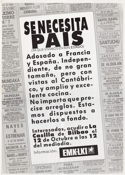 Título: Se necesita país (ya que vivimos en mal estado) [Material gráfico] : adosado a Francia y España, independiente, de no gran tamaño, pero con vistas al Cantábrico... interesados, acudir a La Casilla de Bilbao el 12 de octubre a las 12 del mediodía, información, EMK-LKI