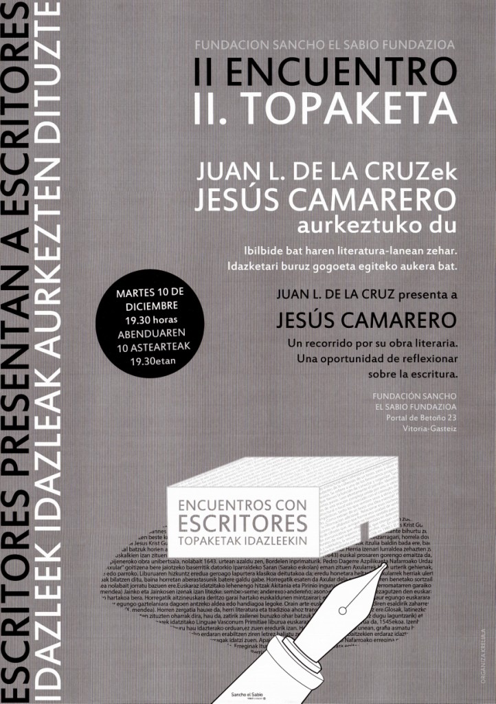 Título: Escritores presentan a escritores [Material gráfico] : II Encuentro : Juan L. de la Cruz presenta a Jesús Camarero... martes 10 de diciembre, 19.30 horas, Fundación Sancho el Sabio, Portal de Betoño 23, Vitoria-Gasteiz = Idazleek idazleak aurkezten dituzte : II. Topaketa : Juan L. de la Cruzek Jesús Camarero aurkeztuko du... abenduaren 10 astearteak 19.30etan / [diseño de Mikel Escalera] ; [organiza] Fundación Sancho el Sabio