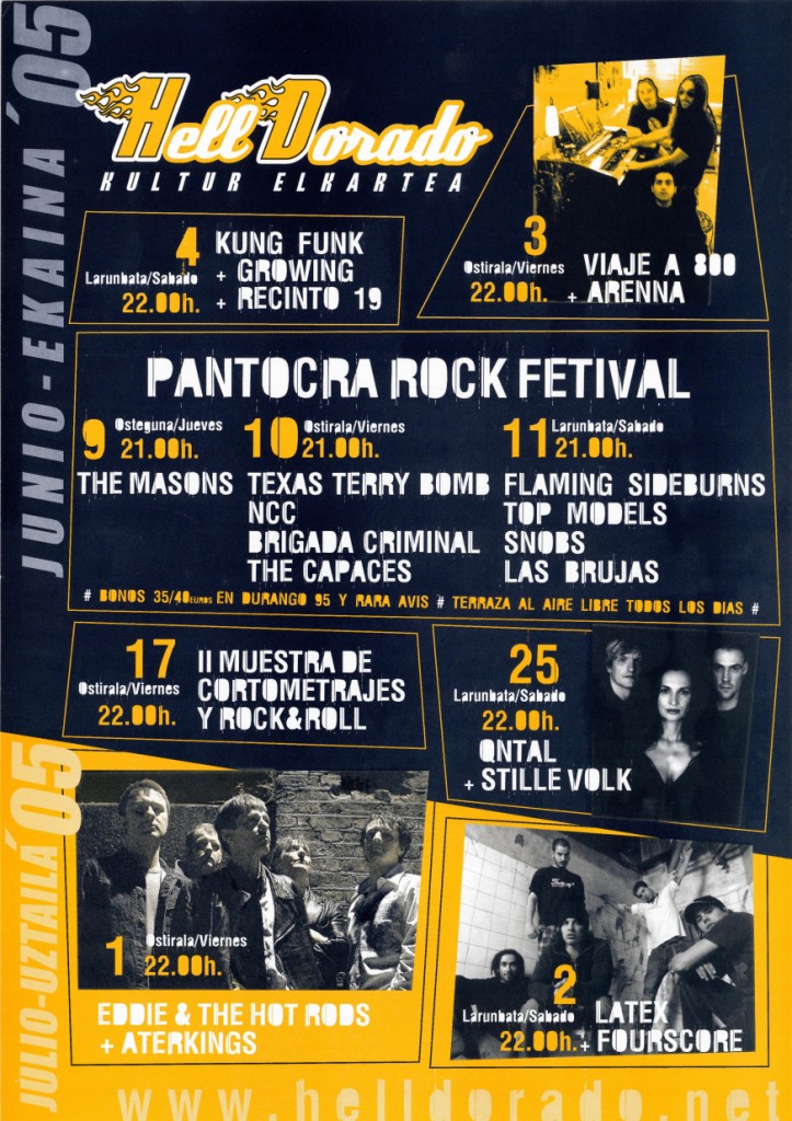 | Description: | Conciertos celebrados en la sala Hell Dorado Kultur Elkartea el 03/06/2005, 25/06/2005, 01/07/2005 y 02/07/2005 Género musical: Indie -Punk - Rock Viaje a 800; Arenna, Kung Funk; Growing; Recinto 19, Pantocra Rock Fetival: The Masons, Texas Terry Bomb, Nuevo Catecismo Católico,Brigada Criminal, The Capaces, Flaming Sideburns,Top Models, Snobs, Las Brujas, II Muestra de Cortometrajes y Rock& Roll, Qntal; Stille Volk, Eddie& The Hot Rods; Aterkings, Latex; Fourscore |