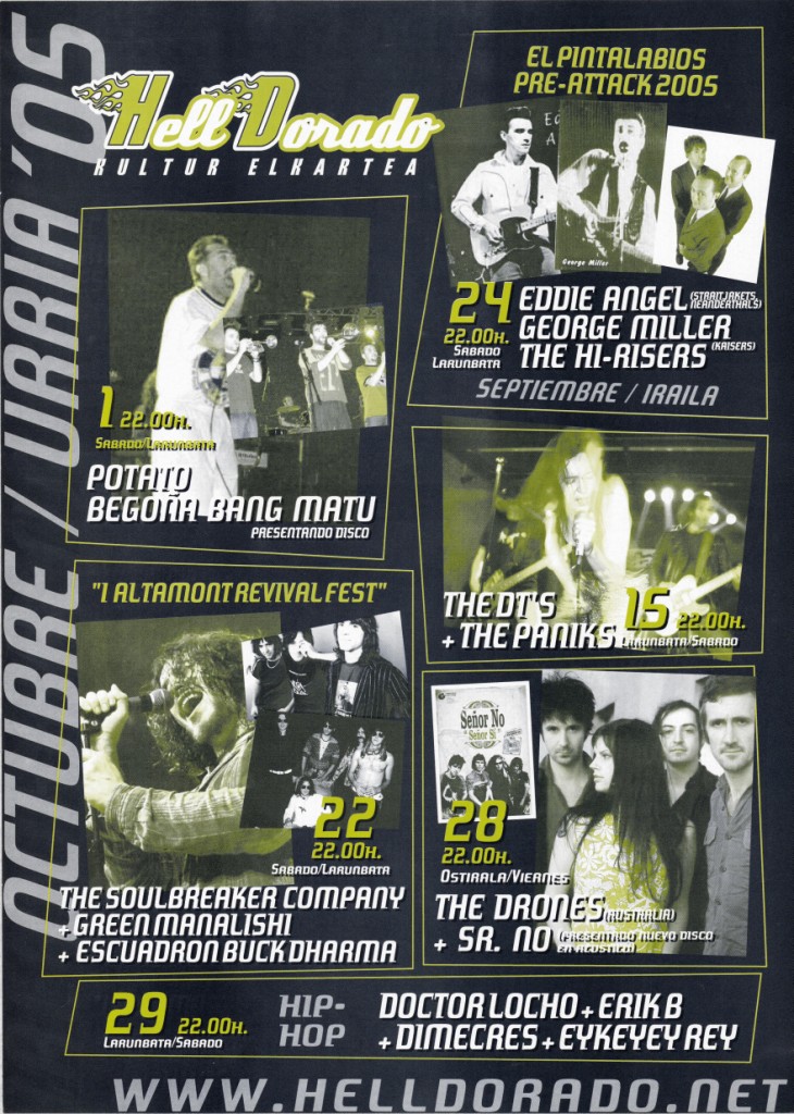 | Resumen: | Conciertos celebrados en la sala Hell Dorado Kultur Elkartea del 01/10/2005 al 29/10/2005 Género musical: Reggae - Ska - Jazz - Garage - Rock - Soul - Psychedelic - Jam Band - R&B - Rockabilly - Surf - Punk - Rap - Hip-Hop Potato; Begoña Bang Matu; The DT?S, The Paniks; The Soulbreaker Company, Green Manalishi, Escuadron Buck Dharma; Eddie Angel; George Miller; The Hi-Risers; The Drones, SR. No; Doctor Locho, Erik B, Dimecres, Eykeyey Rey |