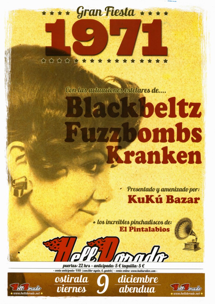Título: Gran fiesta 1971 con las actuaciones estelares de__ Blackbeltz, Fuzzbombs, Kranken [Material gráfico] / Paula Murillas