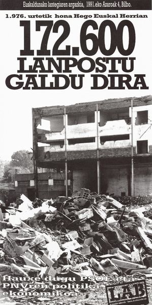 | Izenburua: | 172.600 lanpostu galdu dira [Material gráfico] : 1.976.urtetik hona Hego Euskal Herrian : hauxe dugu PSOE eta PNVren politika ekonomikoa : Euskaldunako lantegiaren argazkia, 1991.eko azaroak 4, Bilbo |