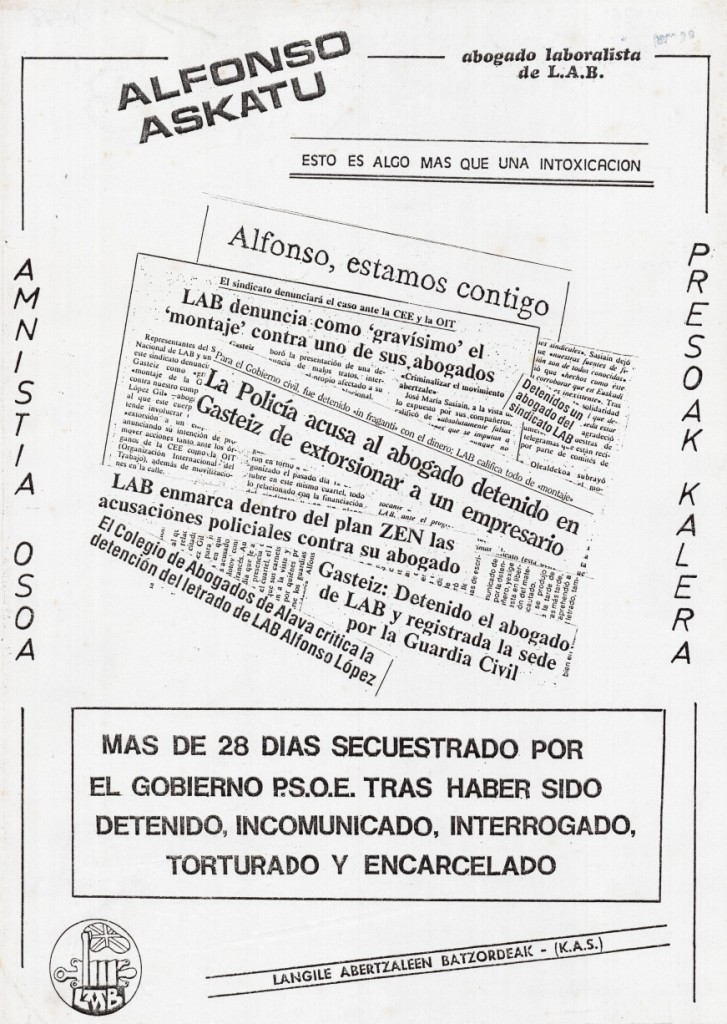 Título: Alfonso askatu [Material gráfico] : abogado laborista de L.A.B más de 28 días secuestrado por el gobierno P.S.O.E. tras haber sido detenido, incomunicado, interrogado, torturado y encarcelado