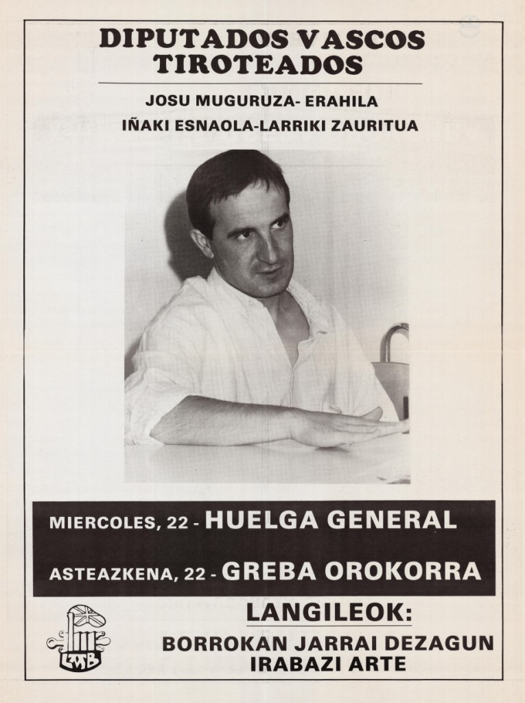 Título: Diputados vascos tiroteados [Material gráfico] : miercoles 22 huelga general : Josu Muguruza erahila, Iñaki Esnaola larriki zauritua : langileok : borrokan jarrai dezagun irabazi arte