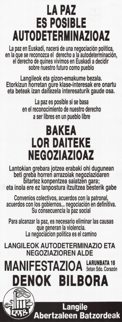 Título: La paz es posible [Material gráfico] : autodeterminazioaz bakea lor daiteke negoziazioaz : langileok autodeterminazioa eta negoziazioaren alde : manifestazioa : denok Bilbora...
