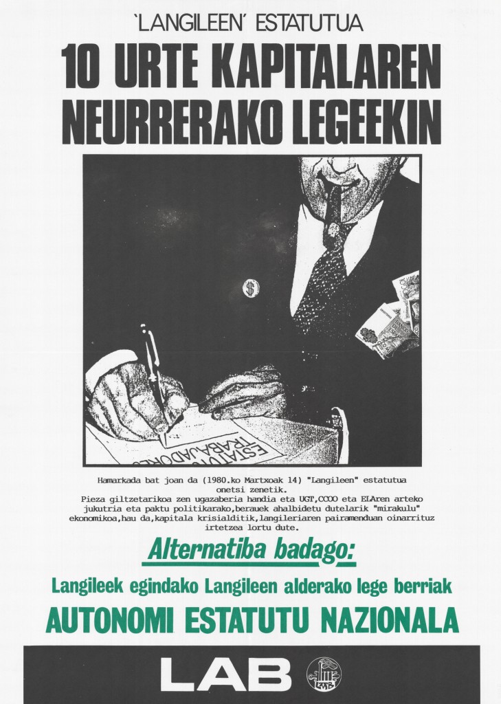Título: 10 urte kapitalaren neurrerako legeekin [Material gráfico] : "Langileen Estatutua" alternatiba badago : autonomi estatutu nazionala...