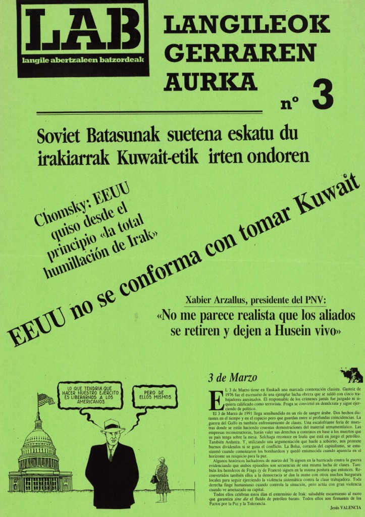 Resumen: En el cartel, texto de Jesús Valencia estableciendo una similitud entre la guerra de Kuwait y los asesinatos del 3 de marzo del 76 en Gasteiz