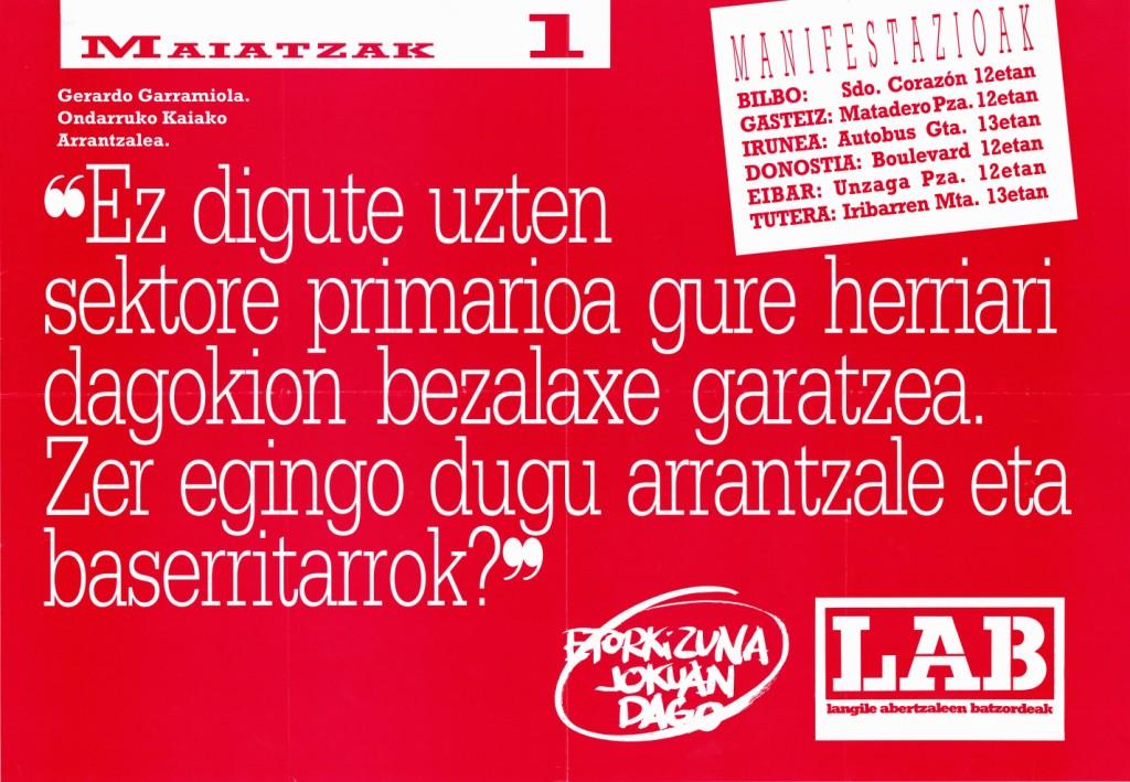 Izenburua: Maiatzak 1 [Material gráfico] : "ez digute uzten sektore primarioa gure herriari dagokion bezalaxe garatzea : zer egingo dugu arrantzale eta baserritarrok?..."