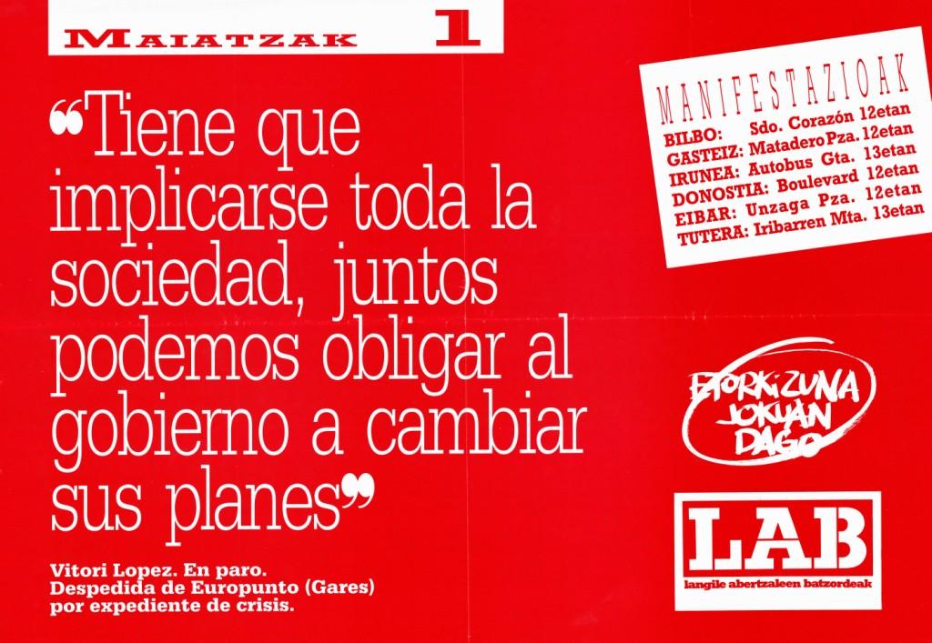 Título: Maiatzak 1 [Material gráfico] : "tiene que implicarse toda la sociedad, juntos podemos obligar al gobierno a cambiar sus planes..."