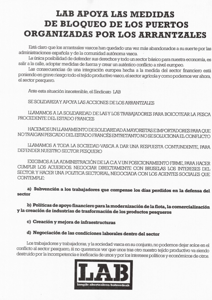 Izenburua: LAB apoya las medidas de bloqueo de los puertos organizadas por los arrantzales... [Material gráfico]