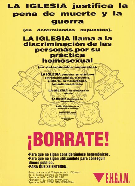 Título: La Iglesia justifica la pena de muerte y la guerra (en determinados supuestos) [Material gráfico] : La Iglesia llama a la discriminación de las personas por su práctica homosexual (en determinados supuestos) : la Iglesia condena las relaciones extramatrimoniales,?