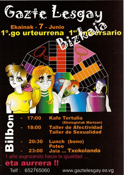 Izenburua: Gaztelesgay Bizkaia ekainak 7 junio 1o. urteurrena [Material gráfico] : 17:00 kafe tertulia (Ekologistak Martxan) : 18:00 taller de afectividad, taller de sexualidad; 20:30 lunch (bono) poteo: 23:00 jaia... txokolanda. .. = Gaztelesgay Bizkaia 1er aniversario : 1 año avanzando