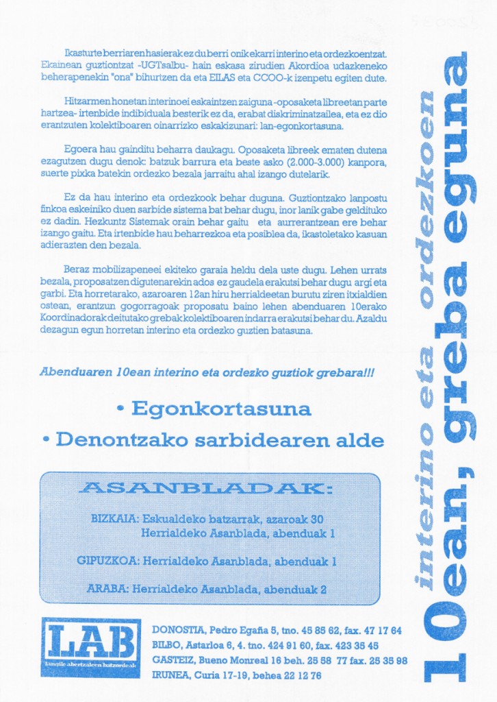 Izenburua: 10ean, greba eguna [Material gráfico] : interino eta ordezkoen : egonkortasuna, denontzako sarbidearen alde