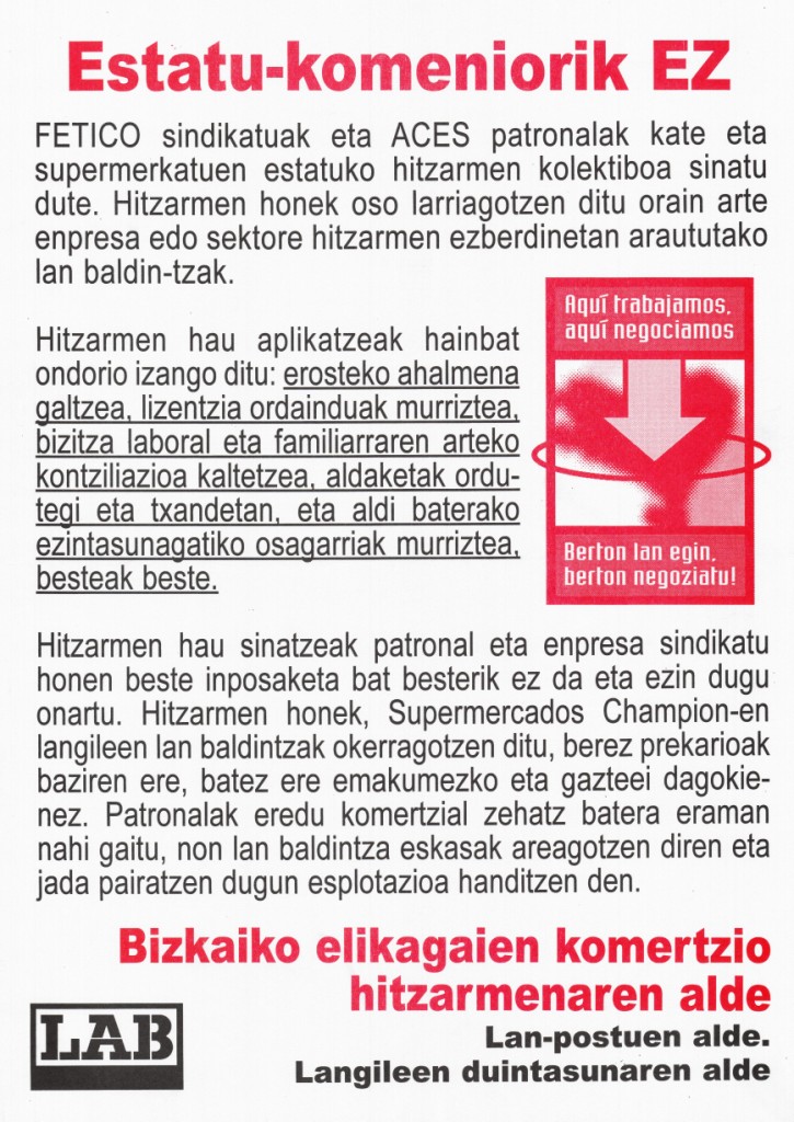Título: Estatu-komeniorik ez [Material gráfico] : Bizkaiko elikagaien komertzio hitzarmenaren alde : lan-postuen alde, langileen duintasunaren alde
