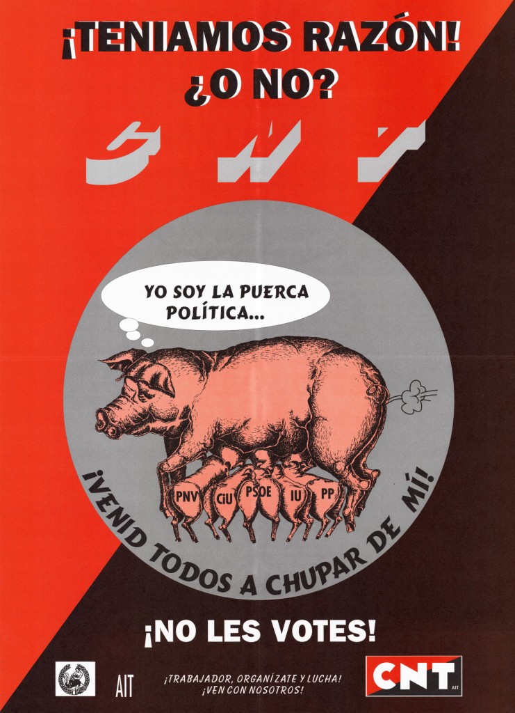 Título: ¡Teníamos razón! ¿o no? [Material gráfico] : ¡venid todos a chupar de mi! : ¡no les votes!, !trabajador, organízate y lucha! : CNT, ¡ven con nosotros!