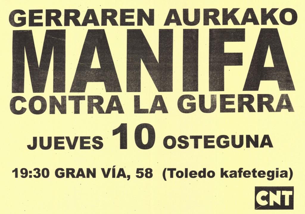 Título: Gerraren aurkako manifa contra la guerra [Material gráfico] = Manifa contra la guerra : jueves 10 osteguna, 19:30 Gran Via, 58 (Toledo kafetegia)