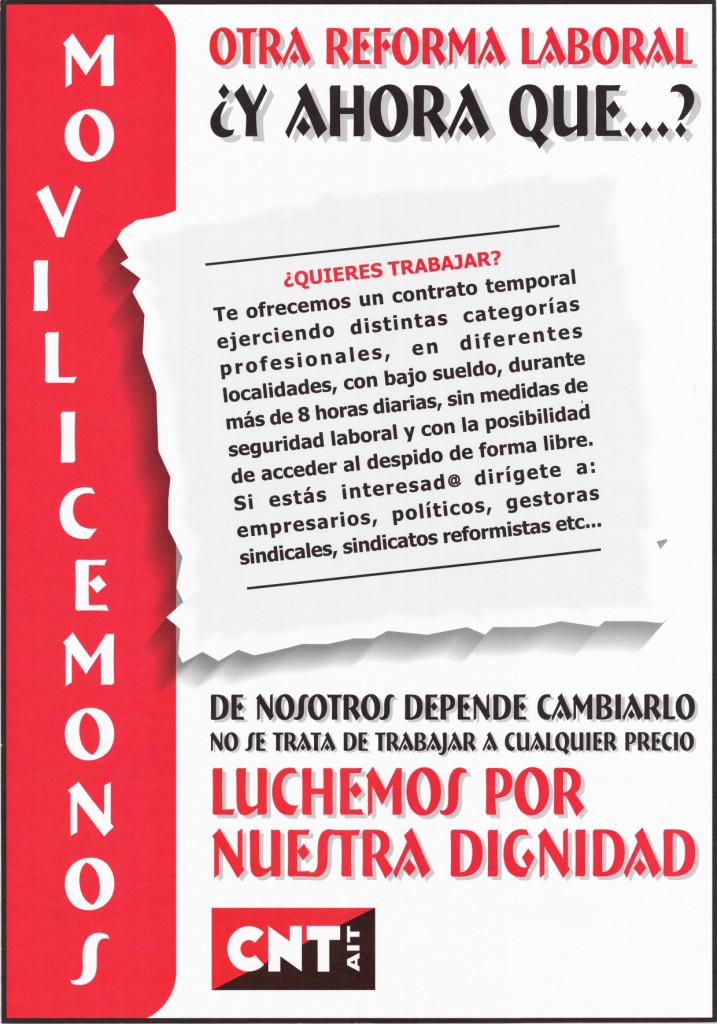 Título: Movilicémonos [Material gráfico] : otra reforma laboral : ¿ y ahora qué?... : luchemos por nuestra dignidad, de nosotros depende cambiarlo : no se trata de trabajar a cualquier precio