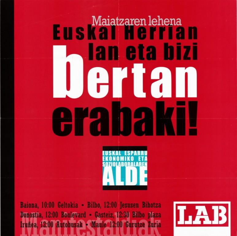 Izenburua: Maiatzaren lehena [Material gráfico] : Euskal Herrian lan eta bizi : bertan erabaki! : euskal esparru ekonomiko eta soziolaboralaren alde