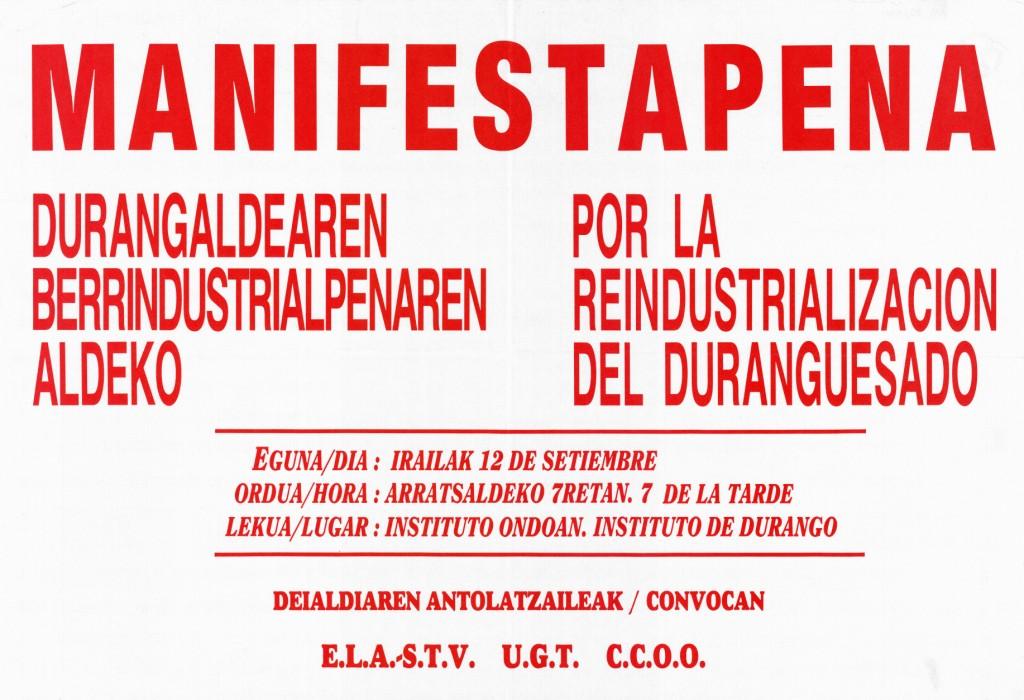 Izenburua: Manifestapena [Material gráfico] : Durangaldearen berrindustrialpenaren aldeko : por la reindustrialización del Duranguesado : 12 septiembre