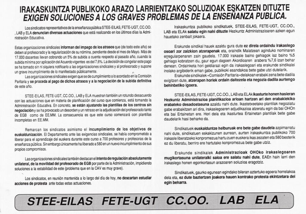 | Título: | Irakaskuntza publikoko arazo larrientzako soluzioak eskatzen dituzte [Material gráfico] = Exigen soluciones a los grandes problemas de la enseñanza pública |