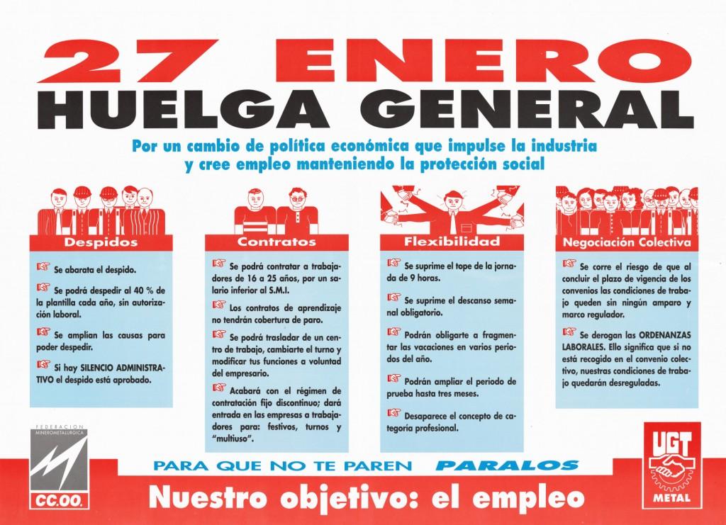 Título: 27 enero huelga general [Material gráfico] : por un cambio de política económica que impulse la industria y cree empleo manteniendo la posición social : nuestro objetivo, el empleo...