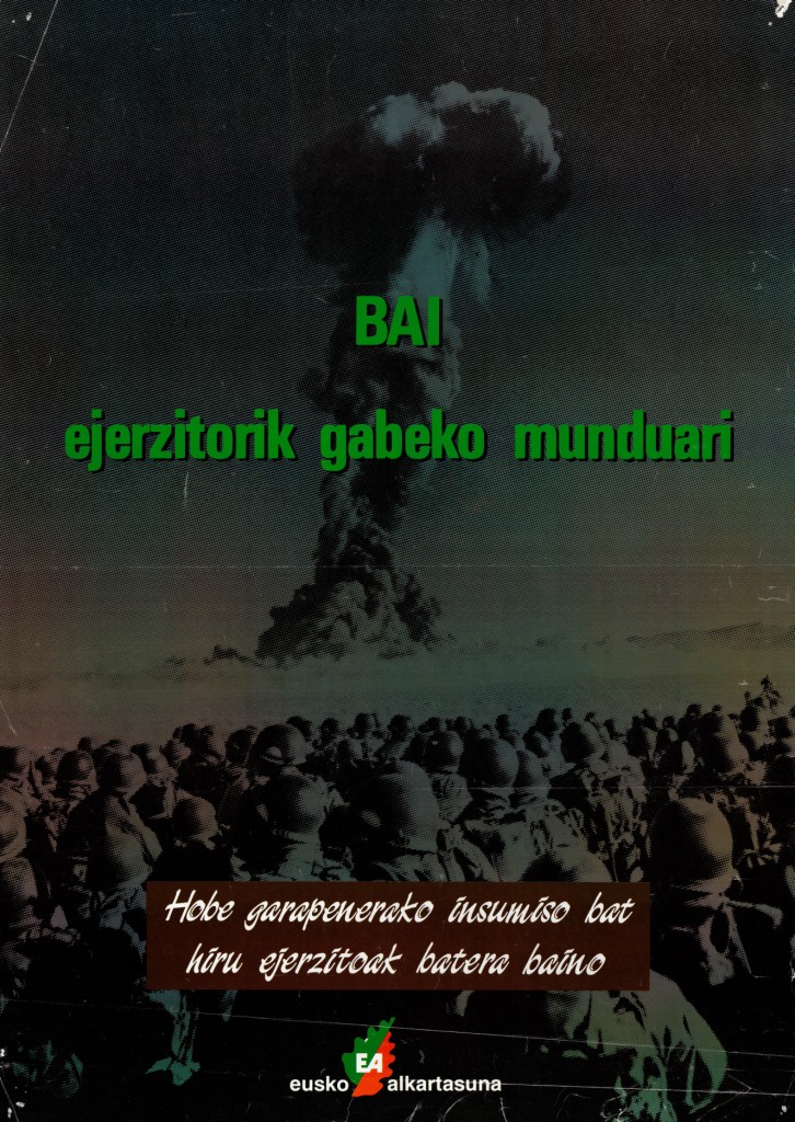 Izenburua: Bai ejerzitorik gabeko munduari [Material gráfico] : hobe garapenerako insumiso bat hiru ejerzitoak batera baino : EA Eusko Alkartasuna