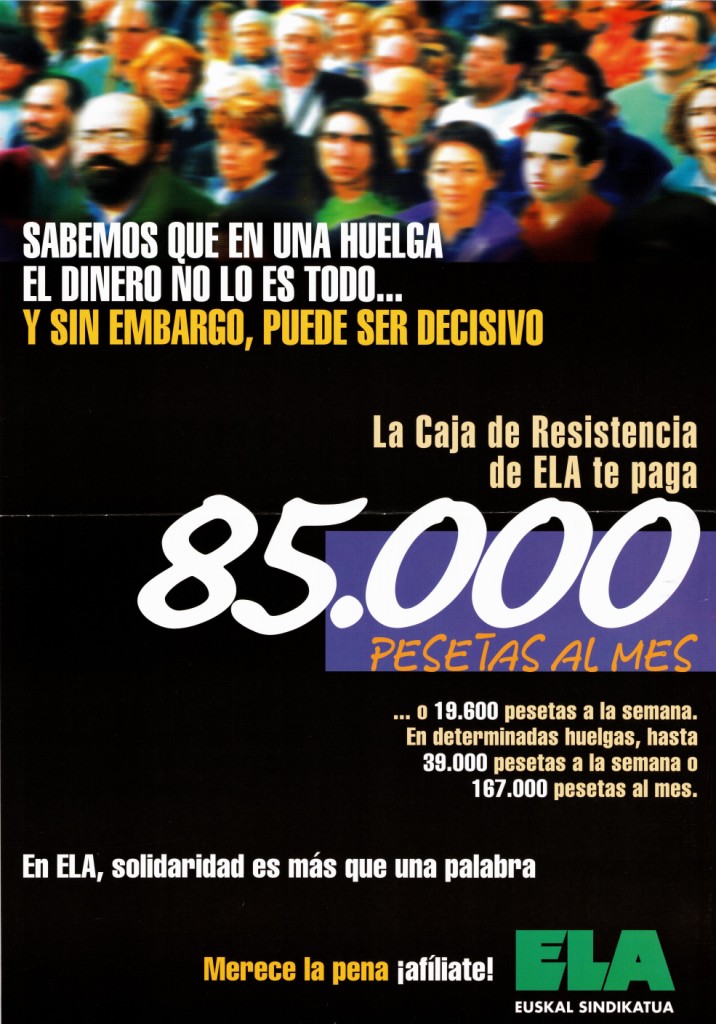 Título: Sabemos que en una huelga el dinero no lo es todo_ [Material gráfico] : y sin embargo, puede ser decisivo : la caja de resistencia de ELA te paga 85000 pesetas al mes o 19600 pesetas a la semana, en determinadas huelgas, hasta 39000 pesetas a la semana ó 167000 pesetas al mes : en ELA, solidaridad es más que una palabra : merece la pena, afíliate