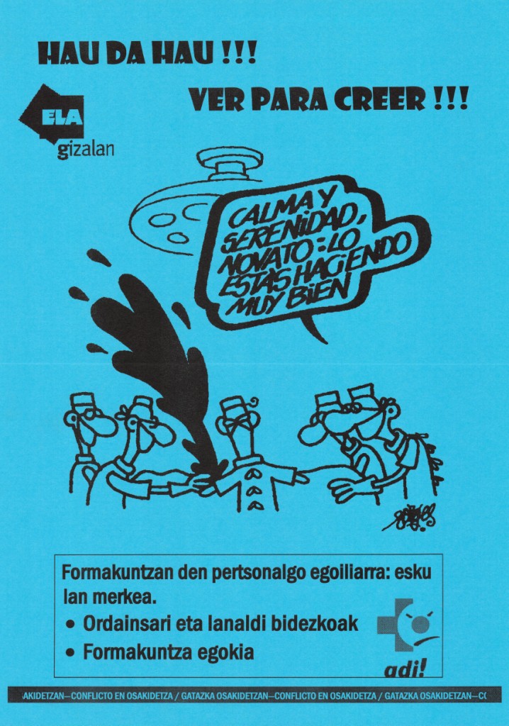 | Izenburua: | Hau da Hau!!! [Material gráfico] = Ver para creer!!! : conflicto en Osakidetza : formakuntzan den pertsonalgo egoiliarra : esku lan merkea : ordainsari eta lanaldi bidezkoak, formakuntza egokia |