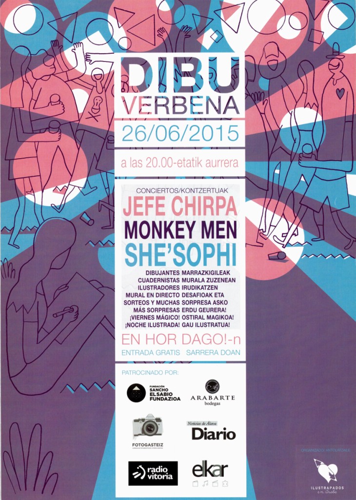 Título: Dibu verbena [Material gráfico] : 26-06-2015 a las 20.00-etatik aurrera : conciertos = kontzertuak Jefe Chirpa, Monkey Men, She's Sophi : dibujantes,... patrocinado por: Fundación Sancho el Sabio Fundazioa...