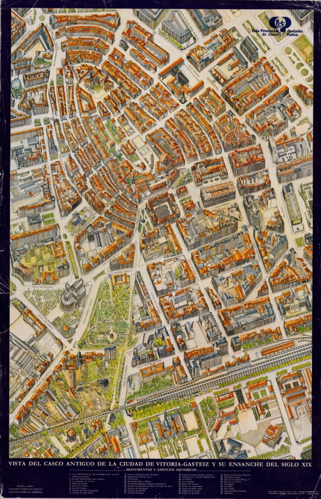 Izenburua: Vista del Casco Antiguo de la ciudad de Vitoria-Gasteiz y su ensanche del siglo XIX [Material gráfico] : monumentos y edificios históricos / proyecto y dibujo, Antonio Margalé Gracia ; Rafael Margalé Herrero