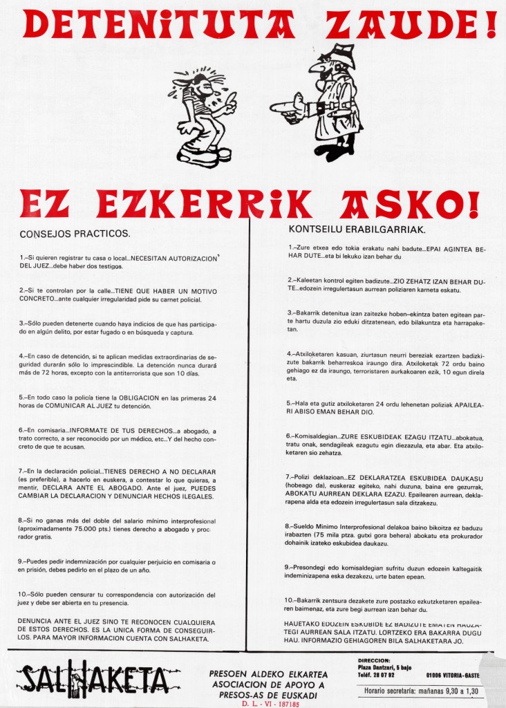 Izenburua: Detenituta zaude! [Material gráfico] : ez ezkerrik asko! : Salhaketa, Presoen Aldeko Elkartea = Asociación de Apoyo a Presos de Euskadi