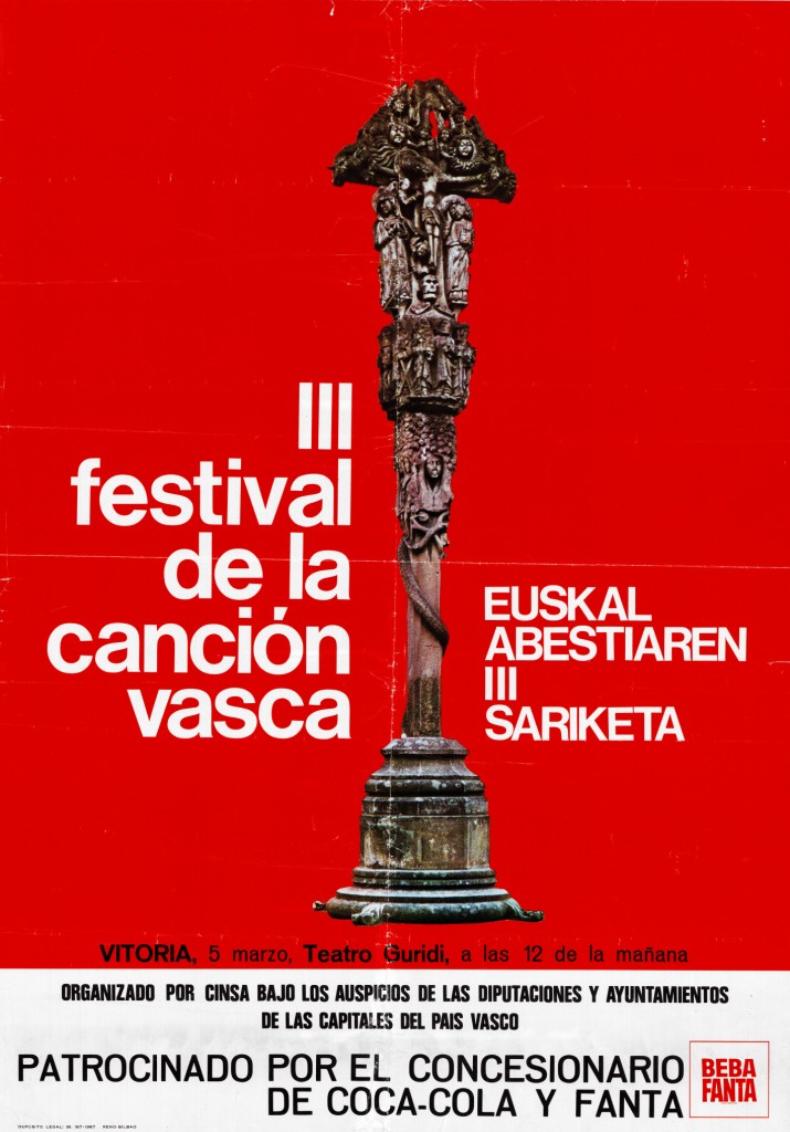 | Título: | III Festival de la Canción Vasca [Material gráfico] = Euskal Abestiaren III Sariketa: organizado por CINSA bajo los auspicios de las diputaciones y ayuntamientos de las capitales del País Vasco : patrocinado por el concesionario de Coca-Cola y Fanta : Vitoria, 5 marzo, Teatro Guridi, a las 12 de la mañana |