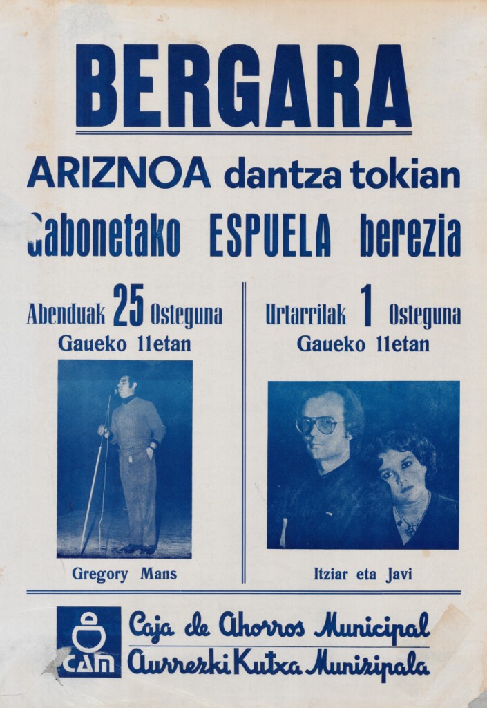 Título: Bergara [Material gráfico] : Ariznoa dantza tokian Gabonetako espuela berezia : abenduak 25 osteguna gaueko 11etan Gregory Mans : urtarrilak 1 osteguna gaueko 11etan Itziar eta Javi
