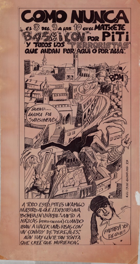 | Izenburua: | Como nunca [Material gráfico] : el 8 del 9 a las 10 en el Matxete : "bassilon" por Piti y todos los "terroristas" que andan por aquí o por "allá" : a todo esto, Piti es un amigo nuestro al que l"explotó" una bomba en Usúrbil junto a Názcas (otro colega) cuando iban a hacer unas risas con un convoy de "perejiles" : aún hay gente tan tonta que cree que murieron |