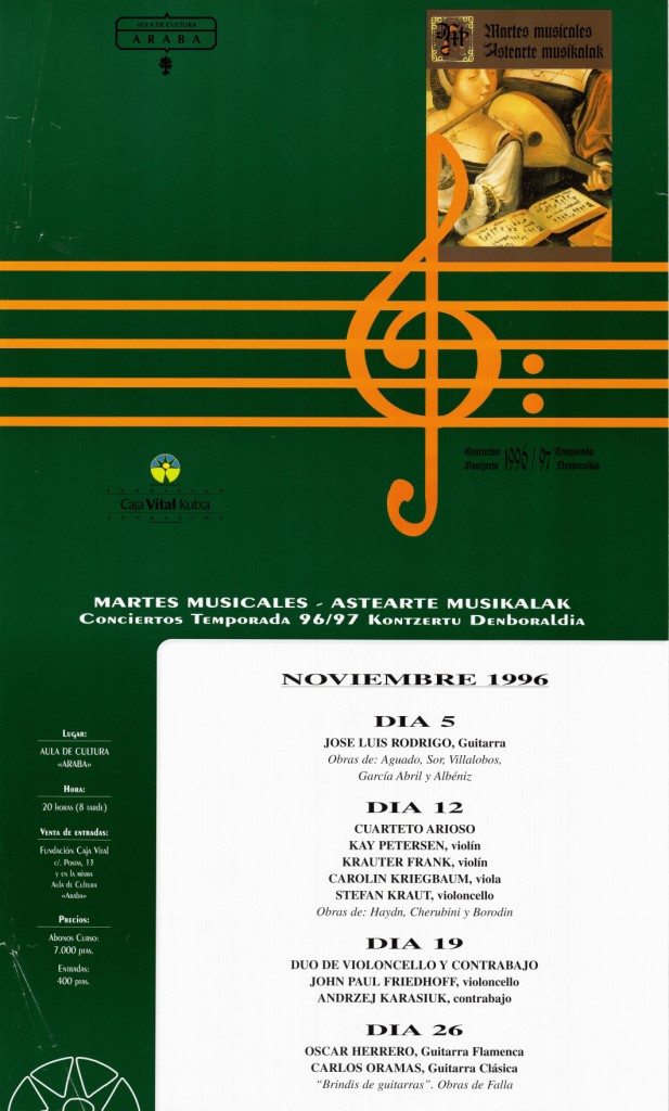 Título: Martes Musicales [Material gráfico] : conciertos temporada 96-97 : noviembre 1996 : Aula de Cultura Araba = Astearte Musikalak : 96-97 kontzertu denboraldia