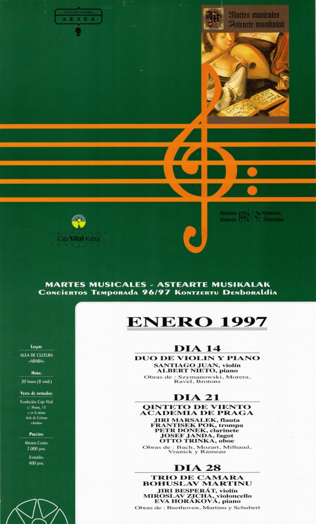 Título: Martes Musicales [Material gráfico] : conciertos temporada 96-97 : enero 1997 : Aula de Cultura Araba = Astearte Musikalak : 96-97 kontzertu denboraldia