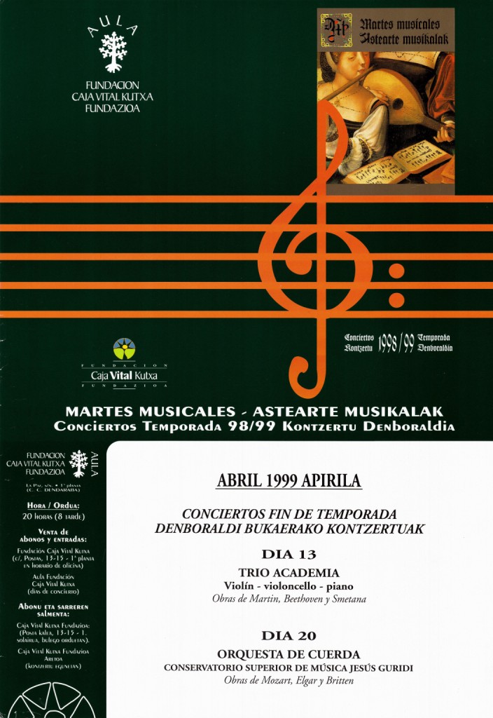 Título: Martes Musicales [Material gráfico] : conciertos temporada 98-99 : abril 1999 apirila : Aula de Cultura Araba = Astearte Musikalak : 98-99 kontzertu denboraldia