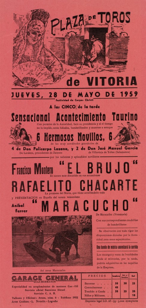 Título: Plaza de Toros de Vitoria [Material gráfico] : jueves, 28 de mayo de 1959 festividad del Corpus Christi ... sensacional acontecimiento taurino : 6 hermosos novillos : Francisco Montero "El Brujo", Rafaelito Chacarte, "Maracucho"...
