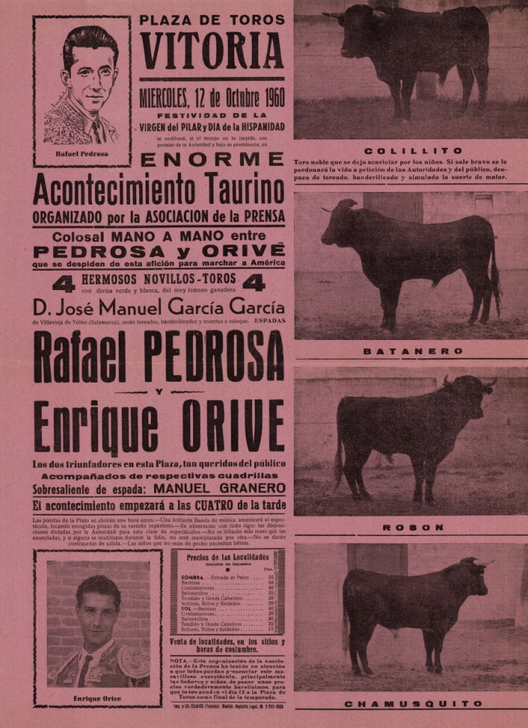 Izenburua: Plaza de Toros de Vitoria [Material gráfico] : miércoles 12 de octubre... enorme acontecimiento taurino... : colosal mano a mano entre Rafael Pedrosa y Enrique Orive : 4 novillos-toros del ganadero D. José Manuel García García