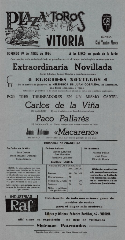 Resumen: Fondo A. Lafuente. Cartel de color azul. Torean Carlos de la Viña, Paco Pallarés y José Antonio "Macareno".