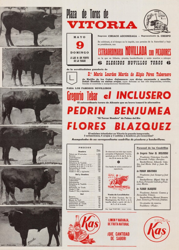 | Deskribapena: | Fondo A. Lafuente. Destaca el empresario vasco Ciriaco Azconizaga. Torean Gregorio Tebar "El Inclusero", Pedrín Benjumea y Flores Blázquez. Ganadería de Da. María Lourdes Martín de Alipio Pérez Tabernero. Buen estado. |