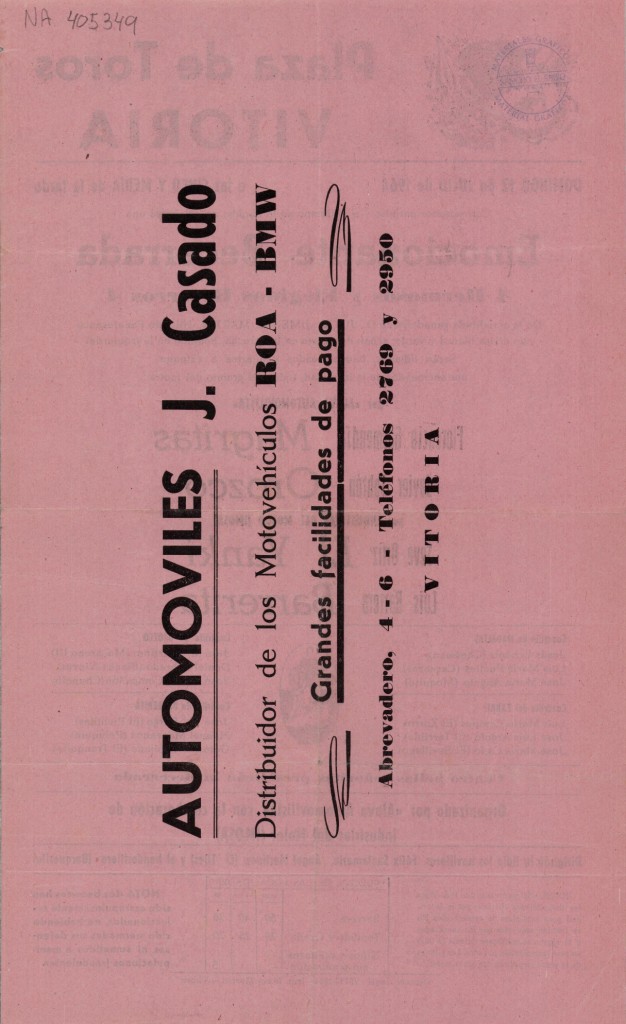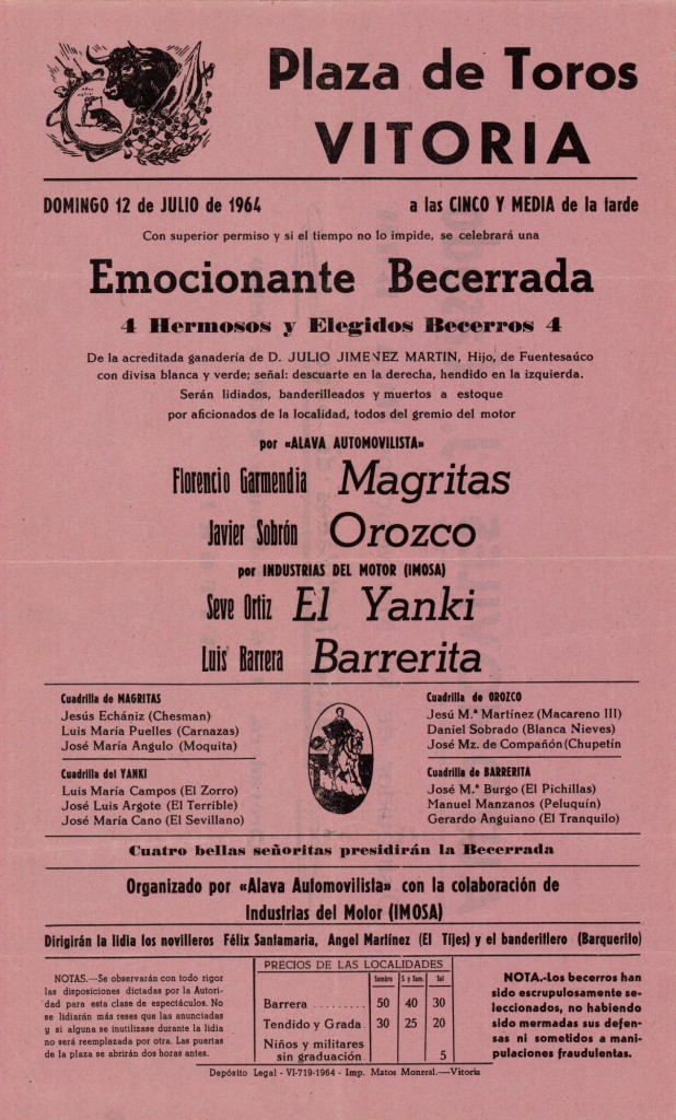 | Deskribapena: | Fondo A. Lafuente. Organizado por "Álava Automovilista" con la colaboración de Industrias del Motor "IMOSA". Torean los aficionados de la localidad Florencio Garmendia "Magritas", Javier Sobrón Orozco, Seve Ortíz "El Yanki" y Luis Barrera "Barrerita". En el verso del cartel publicidad de "Automóviles J. Casado". Buen estado. |