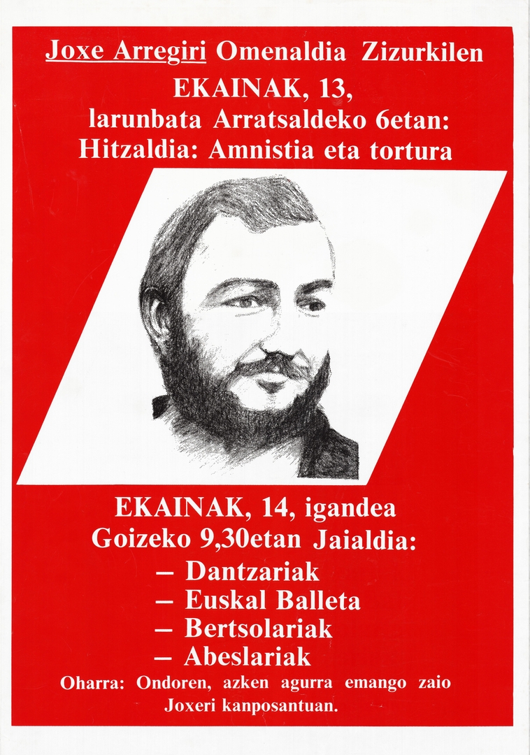 | Título: | Joxe Arregiri omenaldia Zizurkilen [Material gráfico] : ekainak 13, larunbata 6etan hitzaldia, amnistia eta tortura : ekainak, 14, igandea goizeko 9.30etan jaialdia : dantzariak, euskal balleta, bertsolariak, abeslariak : oharra, ondoren, azken agurra emango zaio Joxeri kanposantuan |