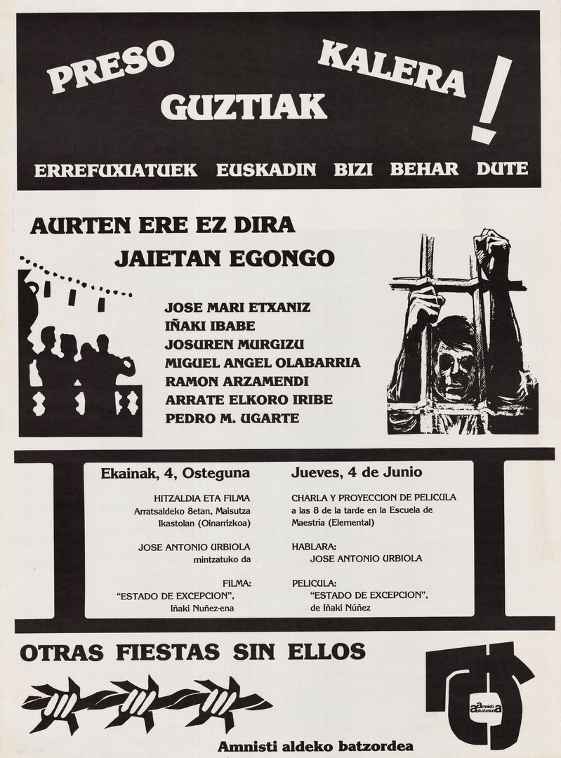 Título: Preso guztiak kalera! [Material gráfico] : errefuxiatuek Euskadin bizi behar dute : aurten ere ez dira jaietan egongo : otras fiestas sin ellos