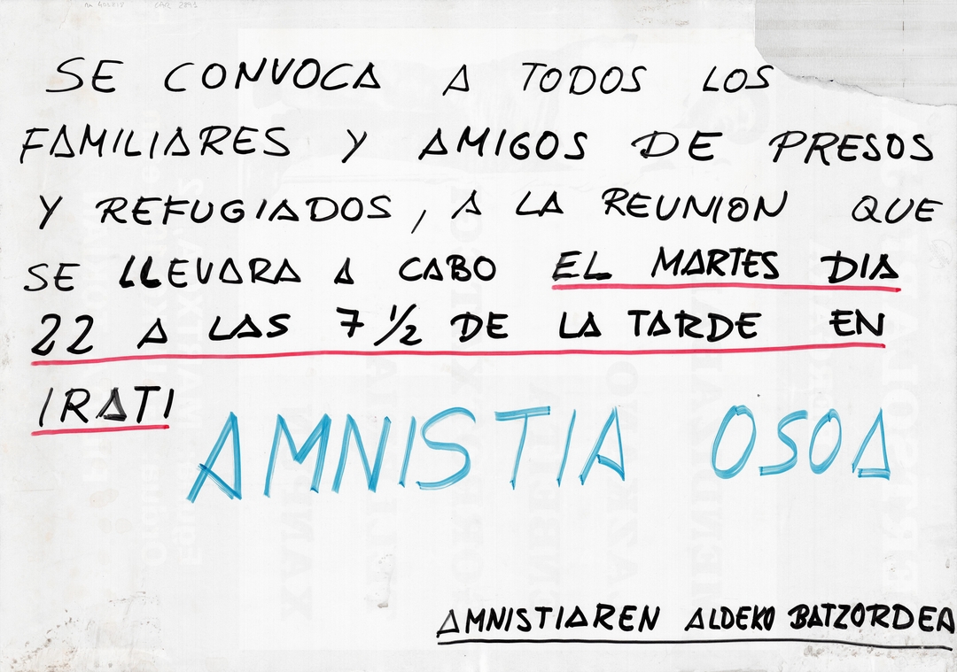Título: Se convoca a todos los familiares y amigos de presos y refugiados a la reunión que se llevará a cabo el martes día 22 en Irati [Material gráfico] : amnistia osoa