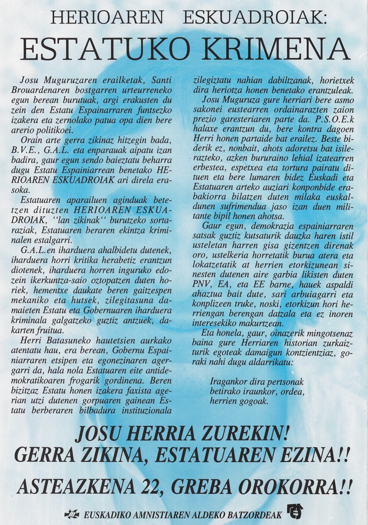 Título: Herioaren eskuadroiak, Estatuko krimena [Material gráfico] : Josu herria zurekin! : gerra zikina, Estatuaren ezina!! : asteazkena 22, greba orokorra!!